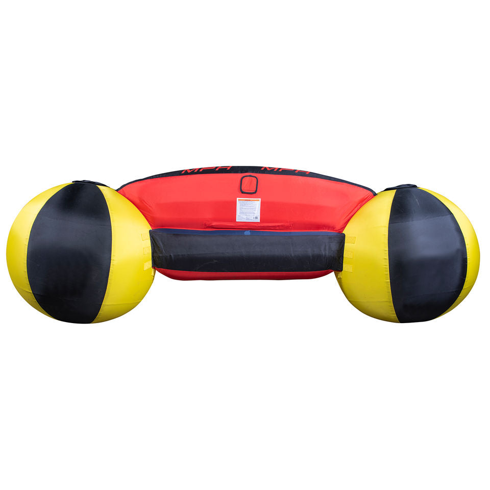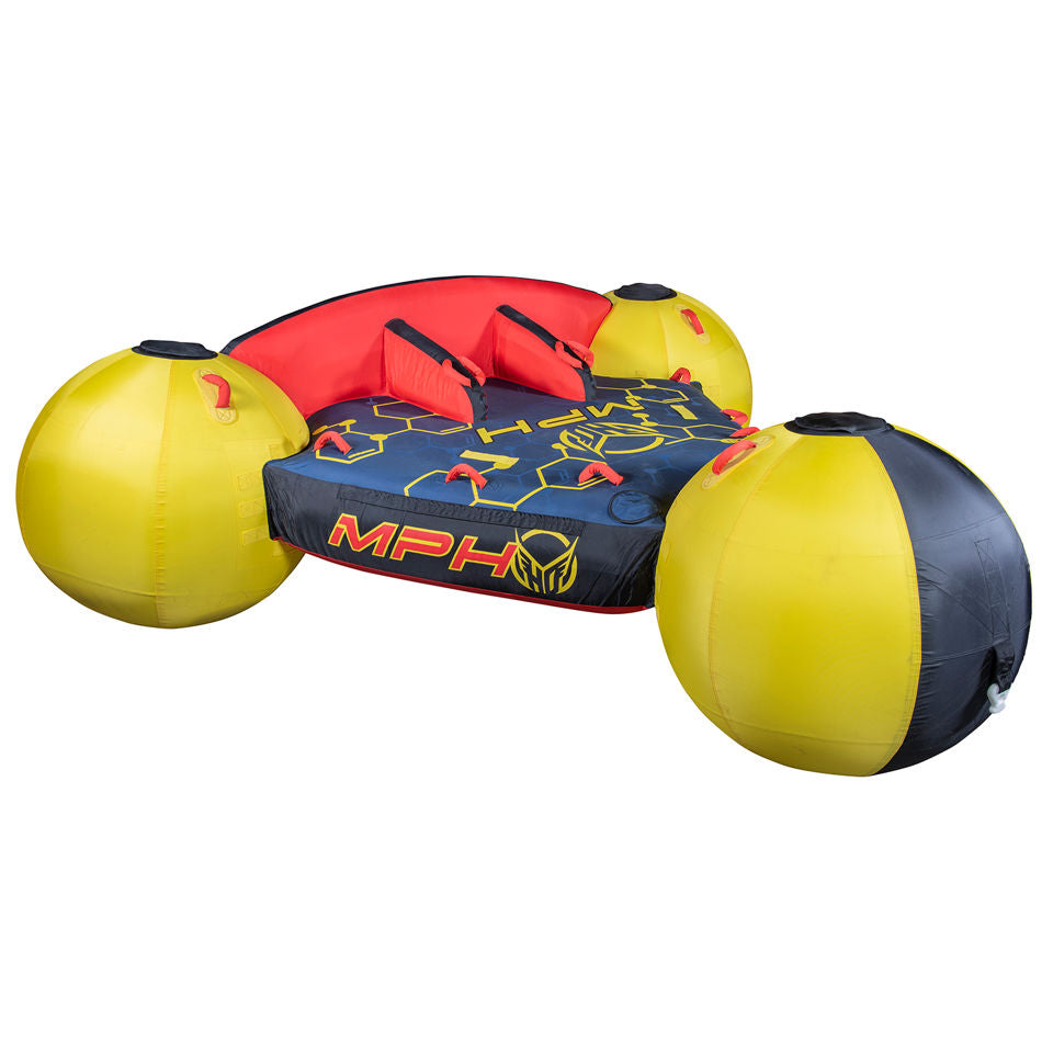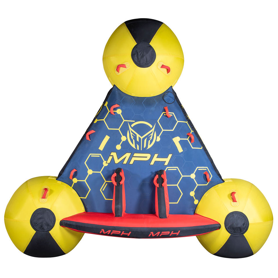 The HO MPH Tube uses the latest and most innovative technology in inflatables to perform like no other tube has ever dreamed! Its innovative, patented design isn’t just for looks. Using 3 spheres, the center platform is suspended above the water with only the spheres contacting the surface. This dramatically lowers the surface contact and drag behind the boat. The result is an extremely quick sliding, large tube that works equally well on rough or smooth water. There are tons of handles, two towing orientations, and the riding positions are only limited by your own imagination.
